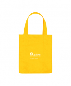 Made Of 80 Gram Non-Woven, Coated Water-Resistant Polypropylene. Great For Grocery Stores, Markets, Book Stores, Etc. 10" Gusset With Matching Covered Bottom Insert. Reusable. 20" Handles. Spot Clean/Air Dry. Complies with Prop 65. 13" W x 15" H x 10" D