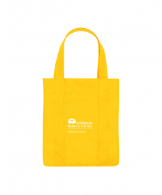 Made Of 80 Gram Non-Woven, Coated Water-Resistant Polypropylene. Great For Grocery Stores, Markets, Book Stores, Etc. 10" Gusset With Matching Covered Bottom Insert. Reusable. 20" Handles. Spot Clean/Air Dry. Complies with Prop 65. 13" W x 15" H x 10" D