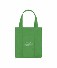 Made Of 80 Gram Non-Woven, Coated Water-Resistant Polypropylene. Great For Grocery Stores, Markets, Book Stores, Etc. 10" Gusset With Matching Covered Bottom Insert. Reusable. 20" Handles. Spot Clean/Air Dry. Complies with Prop 65. 13" W x 15" H x 10" D